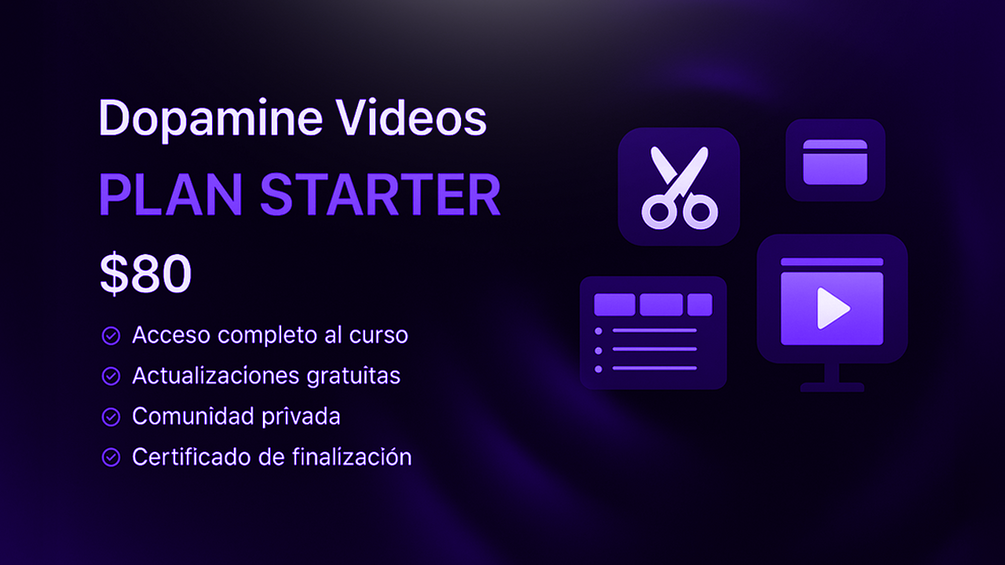 Obtendrás acceso completo al Plan Starter de Dopamine Videos: el curso ideal para quienes quieren aprender a editar sin complicaciones.